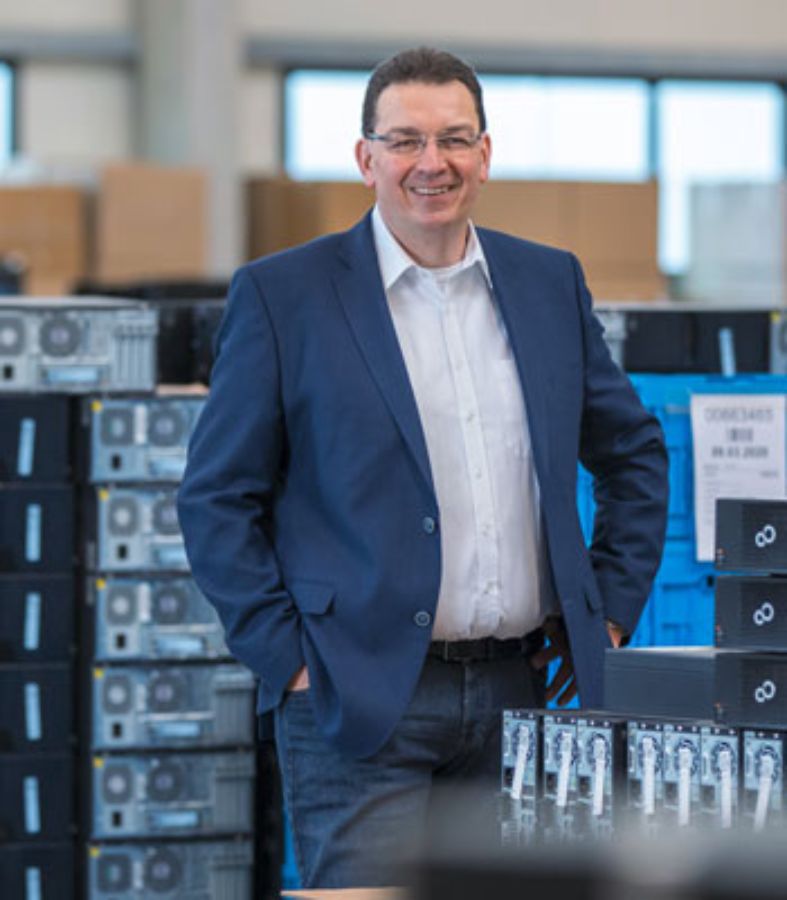 Klaus Form er blandt andet ansvarlig for driftsmæssige processer vedr. afslutning af livscyklusser i virksomhedens to teknologicentre og for salg af renoveret udstyr på det globale IT-brugtmarked. Han og hans medarbejdere fører principperne om cirkulær økonomi ud i virkeligheden hver dag.