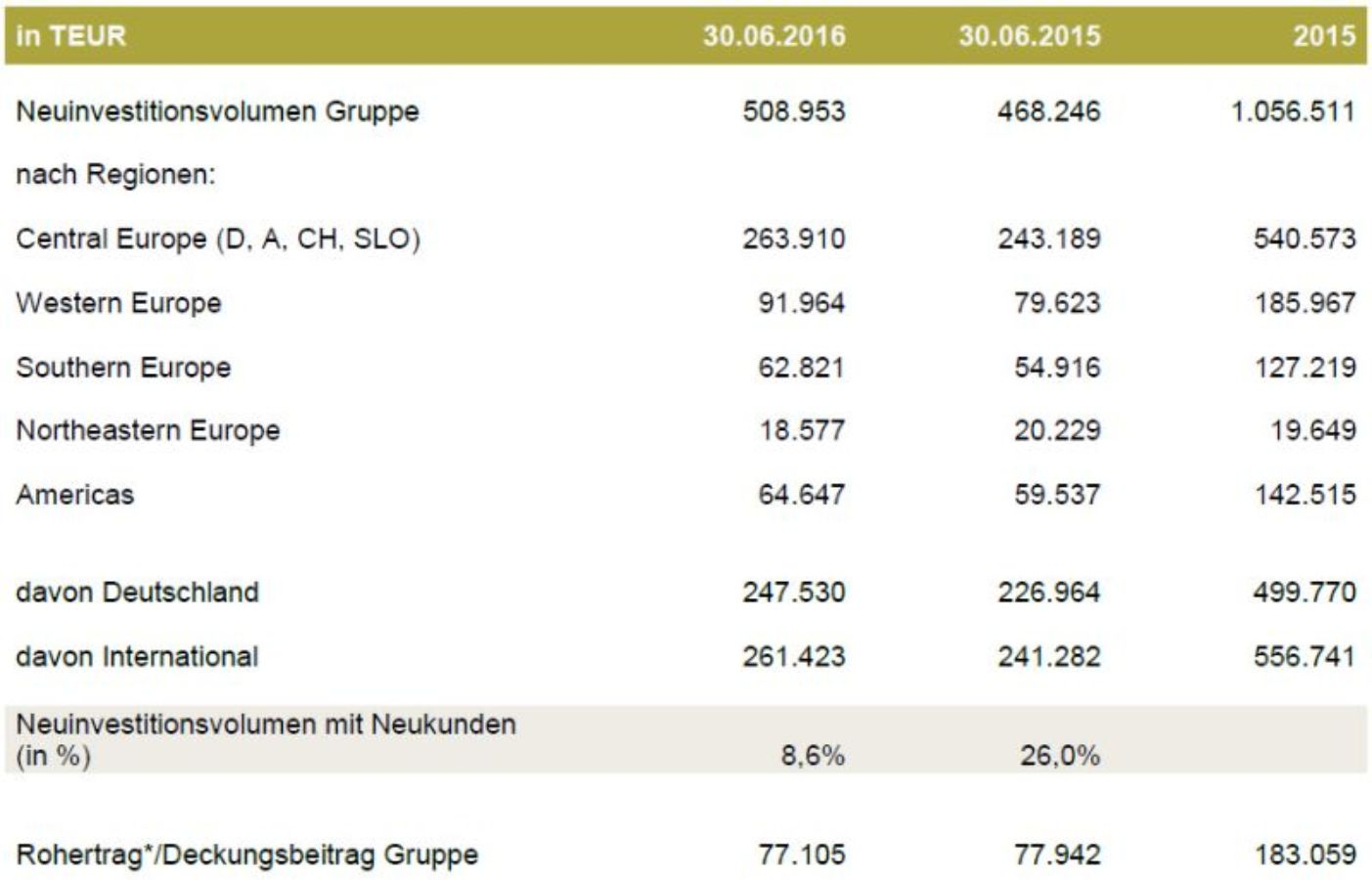 In Central Europe, gross profit held steady at a high level, with slight growth of 2.7 percent. This region therefore contributed 61.1 percent of total gross profit. With the exception of the Americas region, gross profit in the other markets was on a par with the prior-year period. Total gross profit amounted to just over €77 million, which was roughly the same as in the first half of last year.